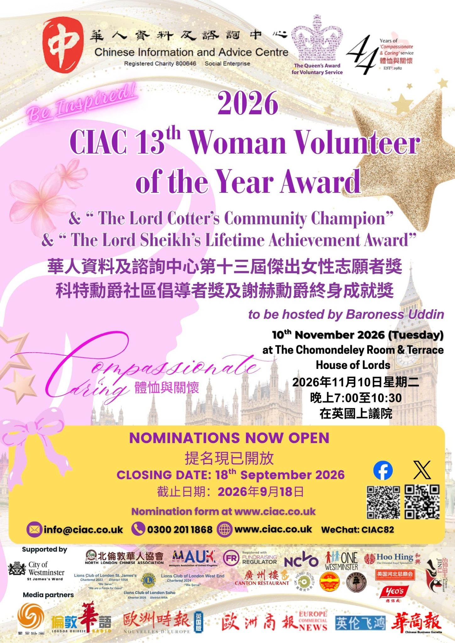 最新資訊 20th 4 月 202620th 4 月 2026Volunteers CIAC 13th Woman Volunteer of the Year Award. Nominations now open Nomination_CIACWomanVolunteerDownload Nomination_TheLordCotter’sCommunityChampion 2026Download Nomination_TheLordSheikh’sLifetime AchievementDownload Download the form here Volunteers